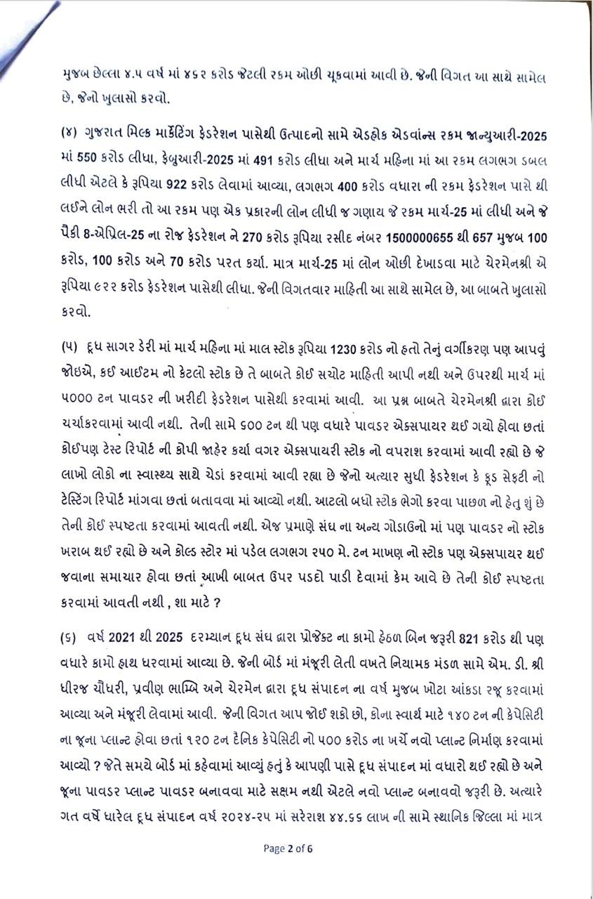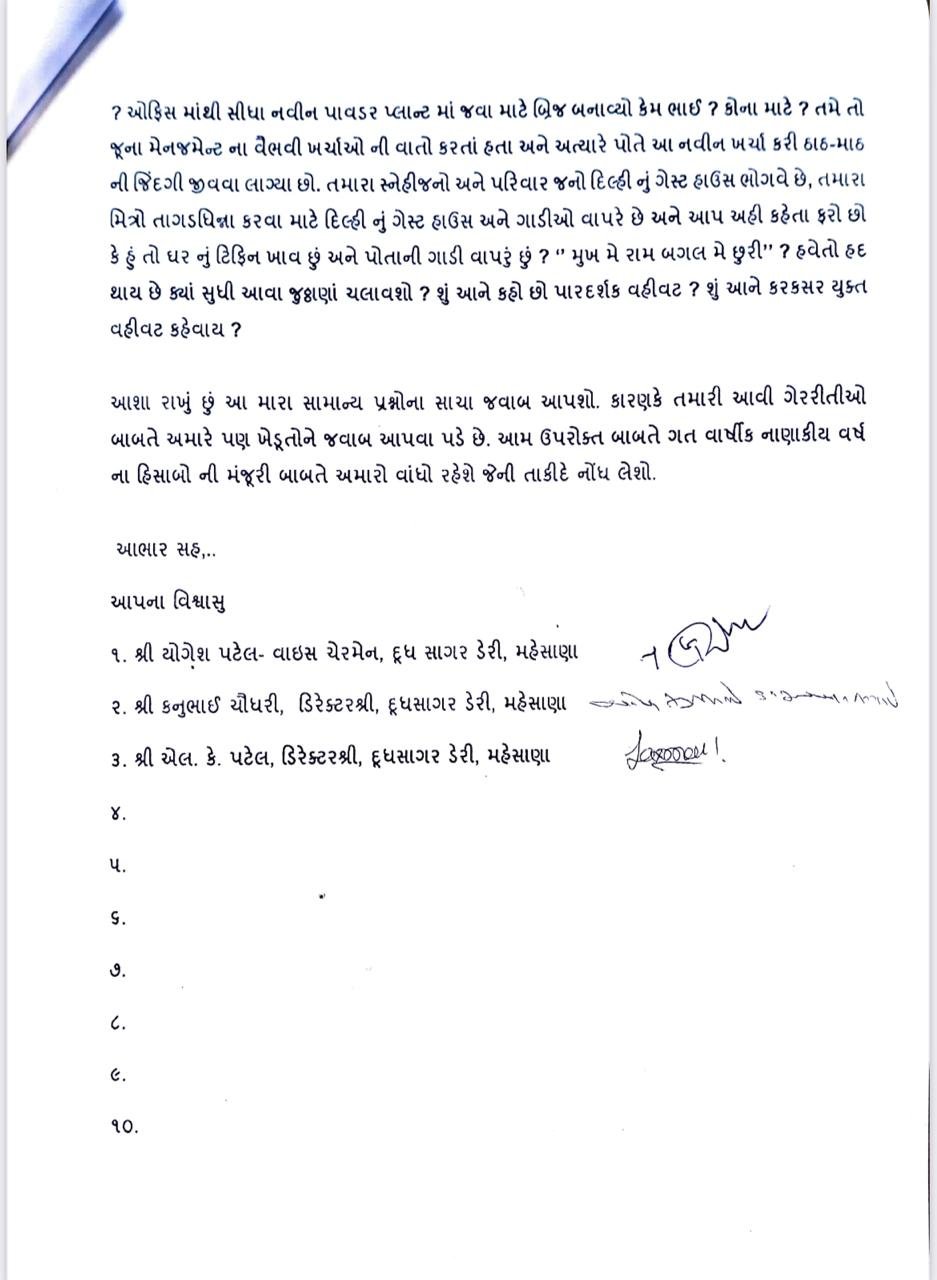દૂધ સાગર ડેરીના વહીવટ બાબતે ખુલાસો કરવા માટે દૂધ સાગરના વાઈસ ચેરમેન યોગેશ પટેલ, ડિરેક્ટર કનુ ચૌધરી અને ડિરેક્ટર એલ કે પટેલે મેનેજિંગ ડિરેક્ટરને પત્ર લખ્યો હતો.