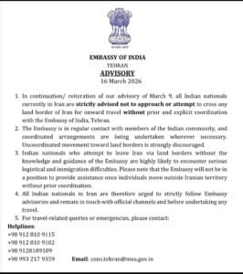 Iran War Update: ઈરાનમાં યુદ્ધની સ્થિતિમાં અહીં રહેતા ભારતીયો માટે તેહરાન ખાતે આવેલા ભારતીય દૂતાવાસ દ્વારા આજે સોમવારે એક નવી એડવાઈઝરી જાહેર કરવામાં આવી છે, જેમાં જણાવાયું છે કે ભારતીય નાગરિકો દૂતાવાસને જાણ કર્યા વિના ઈરાનની સરહદ પાર કરવાનો પ્રયાસ ન કરે,દૂતાવાસ અહીં વસતા ભારતીય લોકોના સતત સંપર્કમાં છે અને જરૂર પડ્યે સાથે મળીને વ્યવસ્થા કરવામાં આવી રહી છે જેથી દુતાવાસને જાણકારી આપ્યા વિના બોર્ડર ક્રોસ નહિ કરવા સલાહ અપાઈ છે.